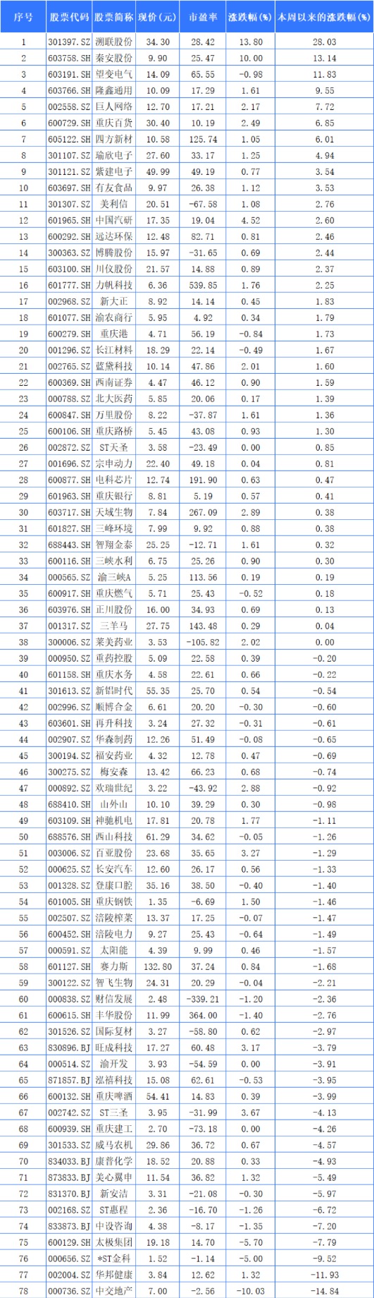 1月24日,本周交易日结束,78家重庆A股,其中收涨37家,收跌40家。